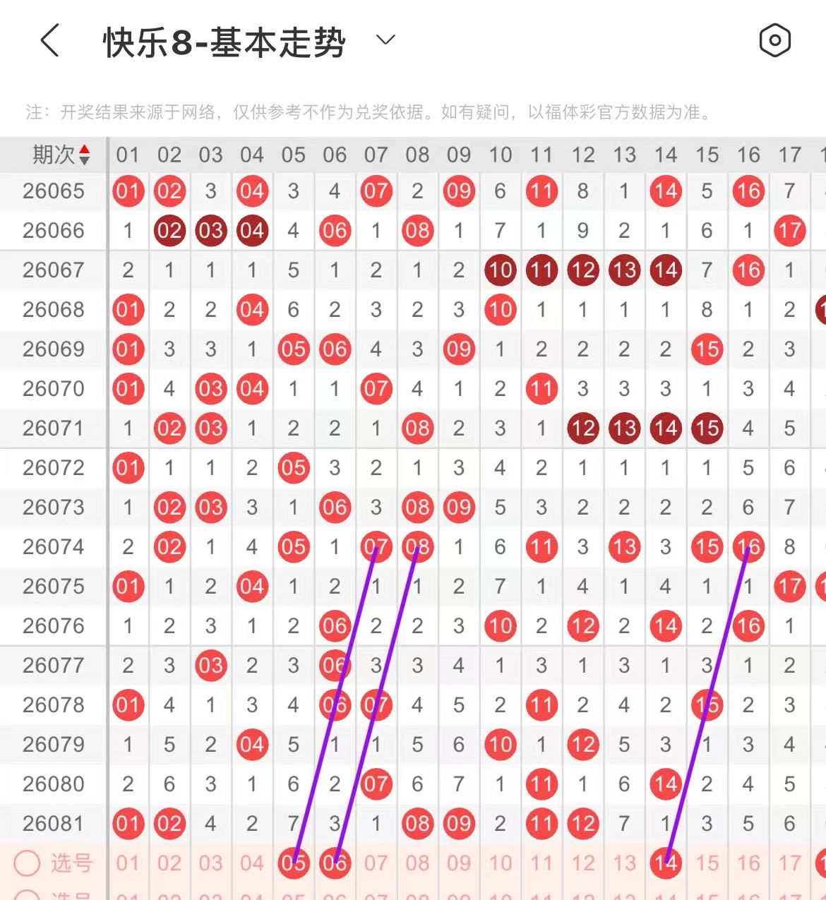 01-10区:本区间上期开出了四个号码,从号码走势图上看,本期可参考的号码走势甚少,注意出号个数突减的可能,在选号上需谨慎,有出号走势的的号码有05.06号,平行斜连出号走势。
