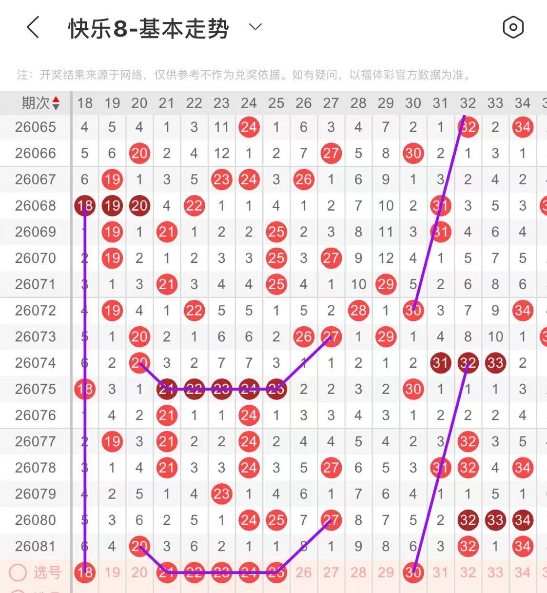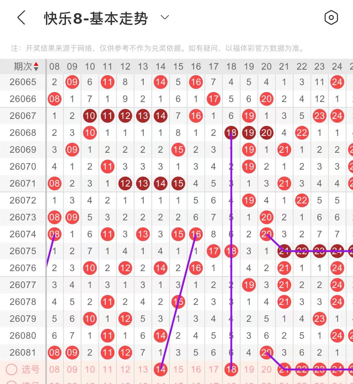 11-20区:本区间上期开出了三个号码,从号码走势图上看,该区现属于温冷区,出号个数在一两个号码之间,有出号走势的的号码有14号,斜连出号走势,18号,隔期相同出号走势。