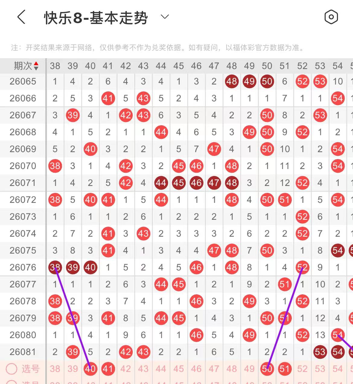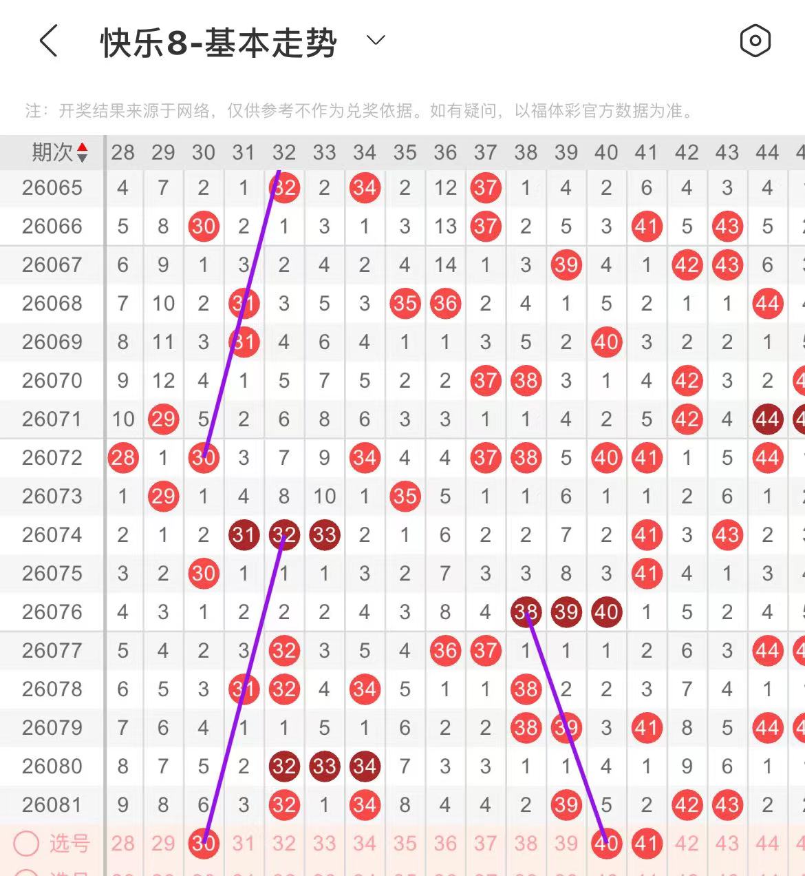 31-40区:本区间上期开出了三个号码,从号码走势图上看,该区连续多期走热,本期注意出号个数突减的可能,在选号上建议以防为主。本期有出号走势的的号码有40号,斜连出号走势。
