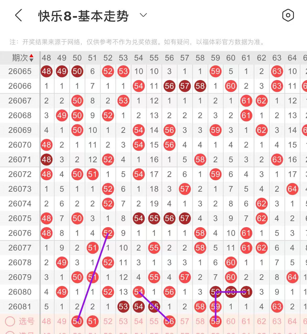 51-60区:本区间上期开出了五个号码,从号码走势图上看,该区现属于热号区,出号个数应该还能保持在三个号码左右,本期有出号走势的号码有56号,斜连出号走势,防51.56同出,59号,走三重,形成半边正方形走势形态。