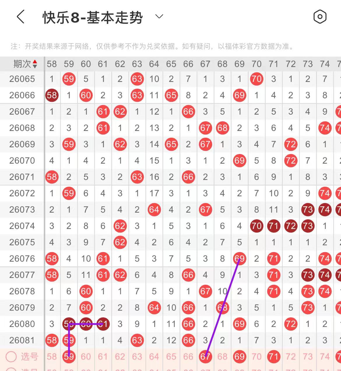 61-70区:本区间上期开出了两个号码,从号码走势图上看,该区现属于温号区,出号个数保持在两个号码左右,本期重点关注后半区后半区号码回补。有出号走势的的号码有67号,斜连出号走势,防67.69同出的可能。