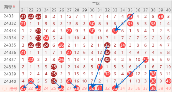 本期的23 24号数字我们注意出一个号码的情况,其中的23号数字我们可以重点关注一下出号情况。本期的28 29 36号数字是属于同意断区内的冷号,本期我们要注意出一个号码的情况,其中的28号数字我们可以重点关注一下。本期的33号数字是属于对应三斜连号码,出号机会是有的,我们可以防守一下28 33号数字同出的情况。上期开出了38 40号数字,本期我们注意出一个重号的情况,其中的38号数字重点关注一下走三重的情况。