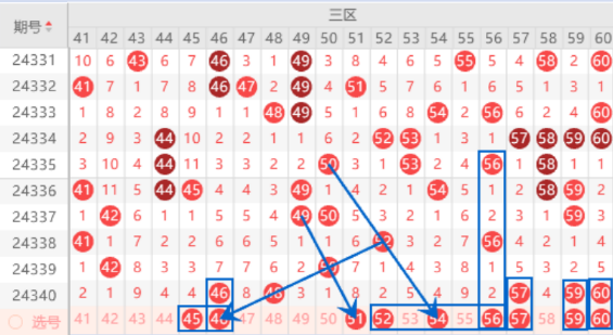 本期的43 44 45号数字是属于重号44号数字的边号回补,已经遗漏4期没有出号了,本期我们注意一下出一个号码的情况,其中的45号数字我们可以重点关注一下出号情况。上期开出了46 48号数字,本期我们注意一下出一个重号的情况,其中的46号数字我们可以重点关注一下出号情况。本期的51 54号数字是属于斜连号码,本期我们注意一下出一个号码的情况,其中的54号数字可以重点关注一下出号情况。上期开出了57 59 60号数字,本期我们注意一下出重号的情况,其中的59 60号数字可以重点关注一下出号情况。