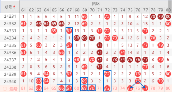 上期开出来59 63号数字,本期我们防守一下61号数字的出号情况。本期的67号数字是属于131走势,上期的69号数字也是131走势,既然上期的69号数字开出来了,那么本期的67号数字的出号机会也是有的,本期我们可以防守一下66 67号数字同出的情况。本期的69 70号数字我们防守一下同出的情况,属于连号斜连号码,出号机会是有的。上期开出了76号数字的重号,本期我们注意一下走三重号和分边的情况。