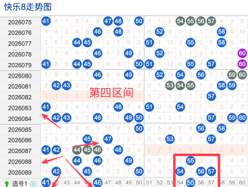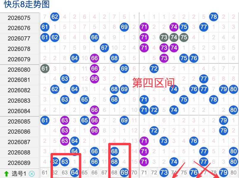上期四区间开出了8个奖号(62.63.66.68.71.74.77.80)上期的四区开8个奖号呈现了一个递增趋势,开出的奖号6头回补4码,7头回补3码,先来看号码64在近 30 期内属于还是稳定的号码,近期出现频率相对热,偶尔会间隔多期后出现一次,这个号码要注意防守,号码69具有一定的间歇性近期活跃度不是很稳定比如有时会间隔3到8期就再次出现,有时会间隔多期,近期整体出现频率比较温热,近期还是要关注的.号码76活跃度近期比较热,有一定的间歇性,整体走势有一定的波动性.