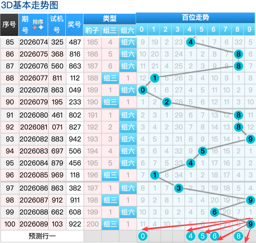 3D上期百位开出9球,这个奖号9是一个热号码的回补落位趋势也是一个比较好的符合百位上的落位点,先看8号球这里还是有机会继续走出一个大号码的分边回补趋势还是要注意防守的,还有一个就是0号球这里的是大号带小号落位形态在这里的机会还是很好的要注意防守,然后6号球这里要注意是一个折返回补落位趋势注意防守,4号球和5号球在百位上要注意可能有机会走出小周期码回补的概率 。
