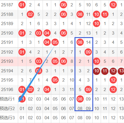 接下来我们重点的去分析197期重点点位的一些号码的组合情况,那么首先我们从01~20来看,那么一分区啊,上一期开了5枚号码,那么本期的话,这5枚号码附近呢,肯定会有一些号码停留的。那么首先我看好重号01。为什么会看中这个01,也是根据这个4114的这样一个结构组合,第二个号码给大家。提示一下这个8号。这个8号的话。没有这个01好,但是这个8号也是有出号点位的。给大家在图中标示出来。
