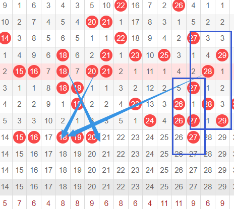那么我们上一期我们的文章,我们这个勾画图呢,二分区选中个四连发,分别是26272933,这个地方呢,我也是根据29这个斜连号进行左右组合的