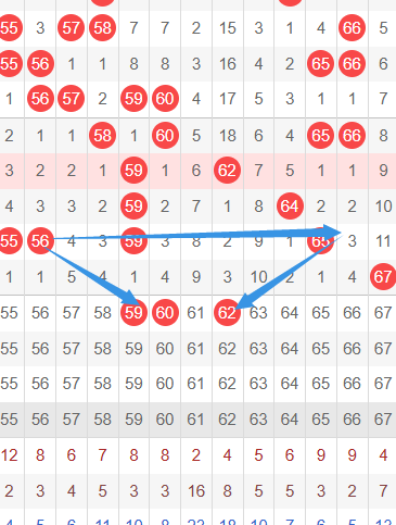 接下来我们重点的看一下这个后面那个大号50以后,50~80的这个区间,50~80呢,这个区间有几个比较明显的号码,一个是52号,这个52号呢,就是太正了,就说白了就是太正了。然后我比较看好的几个组合,一个是59.60.62这个组合已经跟了两期了