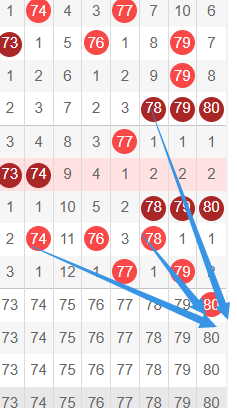 最后我们看一下这个60到八十是有重号的,68.70.但是这两个就是说哪一个都比较好,但是就是只可能只能出一个。他们两个都是斜连号码,然后最看好的号码就是80号