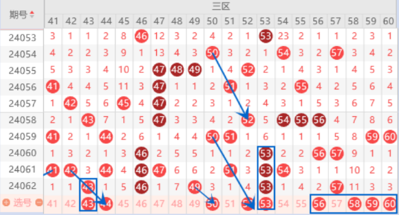 上期开出了43号数字,本期我们注意一下出重号的情况。本期的44号数字我们也是要注意一下出号情况的。本期的51 55 59号数字是属于空三中心号,本期我们要注意开出一个号码的情况。重点关注一下55 59出一个号码的情况就行了。本期的52号数字我们注意一下出号情况,可以防守一下52 53号数字同出的情况。本期的56号数字我们也是要重点关注一下,出号机会是比较大的。