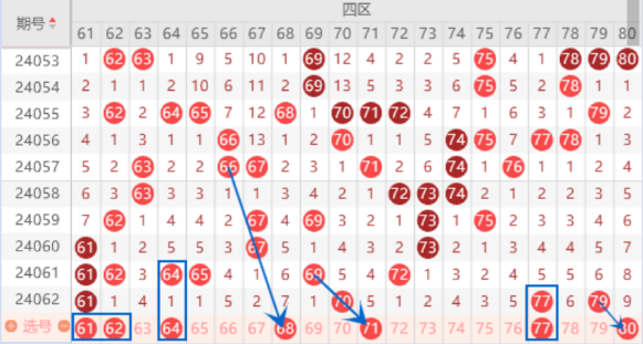 本期的61号数字我们注意一下走4重的情况。本期的62 64 65号数字我们也是要注意落下号码的情况的,我们重点关注一下62 64号数字的出号情况就行了。本期的68号数字我们关注一下出号情况,属于遗漏7期的号码,本期遗漏7期的号码有4个。应该会出一个号码的。本期的71号数字我们防守一下出号情况,既然上期的70号数字开出了,那么本期的71号数字出号机会还是有的。上期开出了77 79号数字,本期我们注意出一个重号的情况。本期的80号数字我们注意一下出号情况,毕竟上期开出了79号数字。