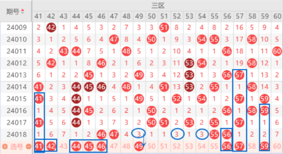 该区间42号数字我们注意一下,本期的42号数字是属于遗漏6期的号吗,本期遗漏6期的号码也是遗漏了4期没有出号了,本期应该是要出号了,需要重点关注一下。本期的43 44 45号数字我们注意出一个号码的情况,重点关注一下44 45号数字出号的情况。本期的57号数字我们注意一下出号情况,属于空一对称号码,有机会模仿58号数字的走势的。本期的58 59 61号数字我们注意回补一个号码的情况,重点关注一下59 61号数字的出号情况。