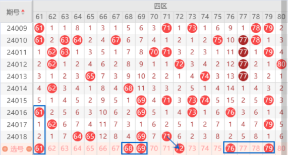 本期的68号数字我们注意一下出号情况,可以防守一下68 69号数字同出的情况。本期的72 75 78号数字我们注意一下,属于2路号码,本期是遗漏6期了,本期有可能会继续断号的,我们不能主做,就放拖码里就行了。本期的76 79号数字我们注意一下同出的情况,尤其是79号数字出号的机会是比较大的,可以重点关注一下。
