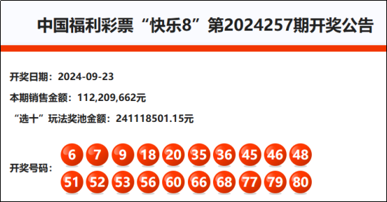 首先我们先来回顾快乐8第2024257期开奖号码: