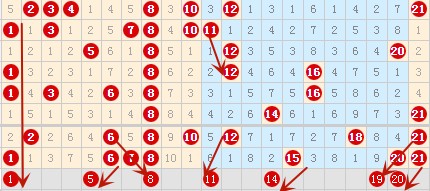上期开在1-10号数字区间开出了4个号码,本期大概率还是要有重号出现的,这里可以参考1 6 8号数字来选重号。从上图中我们可以看到前两期2路的2 8号数字都有了,那么本期2路的5号数字会不会补齐的。看着还是有机会的。在11-20号数字区间已经有明显的转冷趋势了。本期我们就不作为重点作战区域了,参考一下11 14 19 20号数字即可,防守就行。