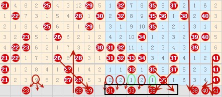 上图中21-30号数字区间开了3个数字,本期出重号的概率还是有点,重号我们就参考21 28号数字出重号即可。该区间有一个小冷号24号数字,我们可以在它本身和它的邻号上做防的。最近期数内像27 28号这种L型的号码组合,落号情况比较频繁的,上期开出这种类型的号码组合有5组,在这5组中预测会开出两个号码出来,可以重点关注一下。所以这里的28号数字我们要重点关注。29号数字和前面的26 27 28号形成了斜四连,上期开出了1组斜四连、3组斜三连,本期预测还会有斜四连出现的。31 32 33 34这个4连号在上期没有落号下来,本期落号情况就变大了,这里可以重点作防。35 37号数字以36号数字形成了对称类型,这种出号也是频繁,所以我们也要重点关注一下35 37号数字中开出一个号码的情况。