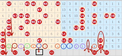上期在该区间只开出了2个号码41号和57号,那么本期我们重点就放在41号到57号数字之间作战吧。在该区间有5组同期遗漏值的号码,号码有点多,这里就不写出来了,我们就从这些号码中定号吧,这里可以参考43 45 56号数字本,再来看看该区域只有49 53号数字没有同期遗漏的,所以我们可以选一个做防守号的。