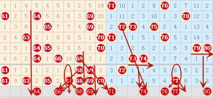 在上期61-70号数字中开了7个号码,开的太多了,那么本期是否会断号呢?这里我们要小心作防了,最好不要再该区间定胆了。上图中64号数字形成了重号空二对称类型,可以参考一下。上期开出的67号数字属于冷号类型,本期在该区间可以关注一下它自己本身和他的邻号66 68号数字。71号数字我们也是要防守一下的。前面已经说过,本期应该是有4斜连出现的。73 74号这个连号上期没有落号,那么本期落号概率就很大了,主要参考74号数字,因为他和前面出号形成规律性了。上期开出的77号数字属于小冷孤号,所以它的周围我们也是要注意的。