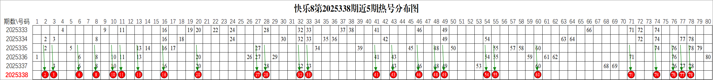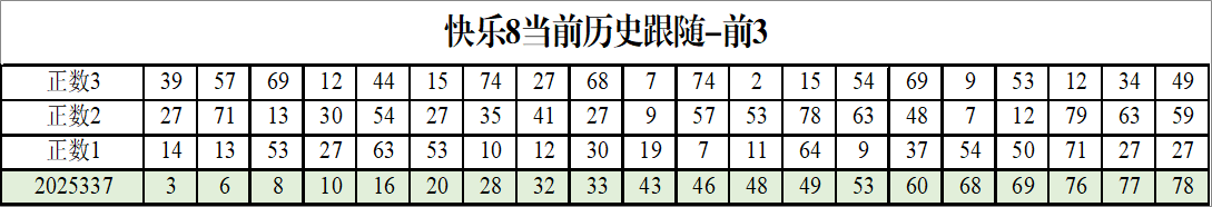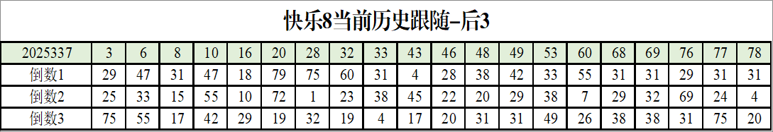 我感觉选热的同时,还要注意防冷条件开出,可以直接选取每个号码跟随出次前三的号码,也可以考虑把出次最后的三个数字加进去,不过这样可能号码太多,可以尝试。图上也能看出单独号码跟随的情况,我就不一一统计每个号码的出次了,我这里考虑提高概率,取每个号码历史跟随的前三号码和后三号码,根据2025337期的号码,我关注正数3和倒数3的号码号码为: