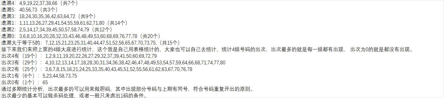 如果把对数和补数合起来有40个号码,中间可能还会产生一下重复数,通过近几期的统计分析,以上期数据进行补数对数计算推算下一期的概率不高。为提高概率,我主要是用前两期的数据来进行对数补数推算,然后再组成一个集合,作为我的第四组大底号码。