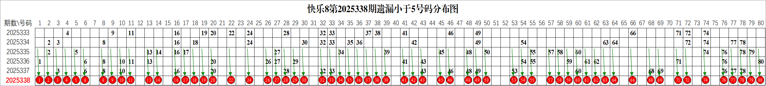 所以这个条件值得关注,从号码分布图上我们可以分析出,遗漏小于5期的号码有: