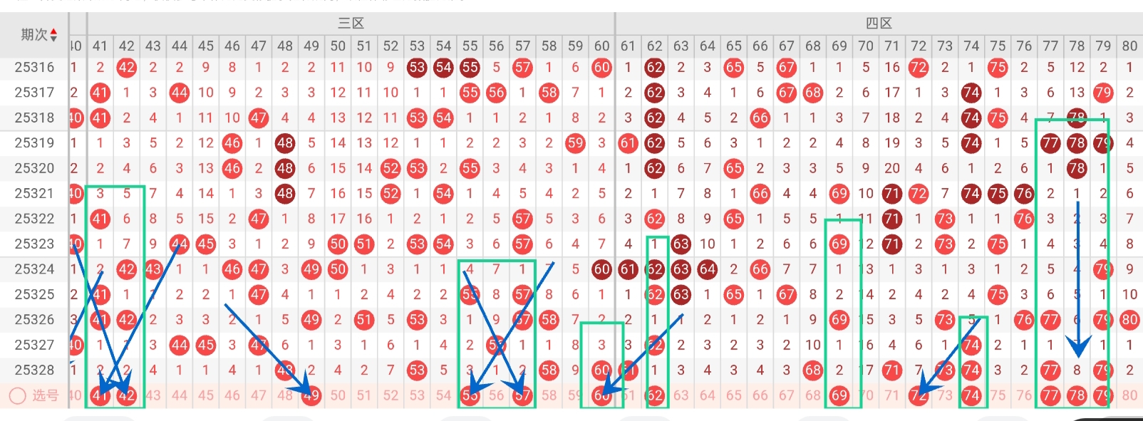 四区间上期开出61-68-71-73-74-77-79,共7个号码,本期大家可以根据尾数、隔期码、以及边码走势情况,本期首先需看72相邻码、74会再出现;上期61-74区间开出密集号,本期69出号机会比较大,本期四区有连续号77-78-79预测会出,上期龙头61,凤尾79,本期预测龙头62、凤尾79,本四区间建议大家关注号码65会出,再根据号码走势预防连续号77-78-79出现。综合分析筛选,本期四区推荐:62-69-72-77-78-79