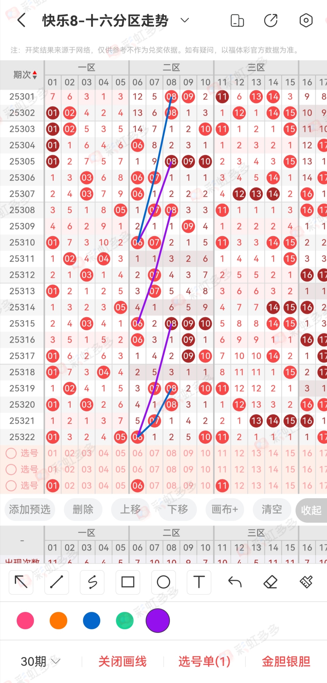 今天分享两张图,注意一下逻辑巧合。不知道规律是不是规律的。第一张图,注意一下08 07 06之间的牵扯。我一开始以为只是2期遗漏的08会存在递减遗漏期数顺位到06,可是后面的数据出现了变化。这里只能说是短期的点位,08 07 06,06的重号判断可以根据07的状态,我们目前出现的两期都是规律的,要么07重号然后带动06走重。所以这样子考虑今天的06不考虑重号。但是这里和目前的基本走势存在冲突。无论怎么样分析,今天的0头和1头实实在在存在重号,但是通过这里的06点位就是不走重。说实话,走势图看多了,都会存在错觉,今天的0头1头我说双空区,都感觉有点儿疯了。但是这里能够总结的点位就是要么走重要么空区。但是重号定位存在逻辑冲突,每一个重号的点都存在变量影响。要说一个昨天的数据分析错误,比方说昨天直播给大家推荐的定位,28 31和23 26的关系,但是昨天还是很坚强的开出来28。那么这里的0头1头数据也是一样,不好选择。问题交给你们解决,我给大家的推荐就是不考虑。比方说点位11会不会走重,或者说顺位20,数据都是开出来过的,所以方向较多。