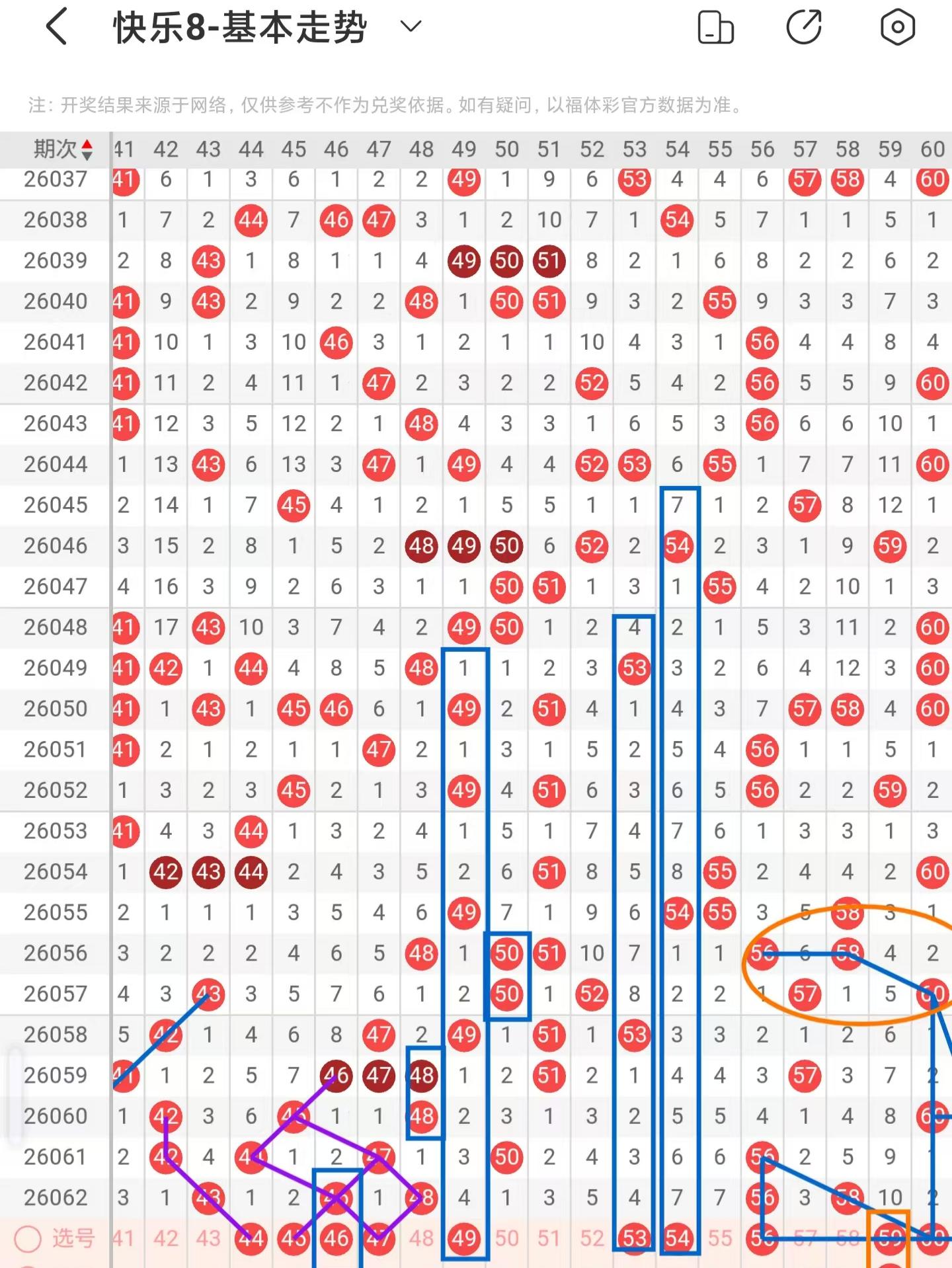 三区间上期稳定落号,一共开出五个号码球,本期考虑等同数量的号码球,注意两重码带三斜连走势回补的44号码球,同时也是期数和值加减法号码球,注意百期相似形态的45号码球,同时也是斜连走势回补号码球,注意阶梯落位重码走势的46号码球,防守梅花形态的47号码球,注意期数和值加减法的49号码球,同时也是斜连走势回补号码球,注意隔期对称回补的53、54号码球,注意直角三角形走势的56、60号码球,注意近期56、58号码球同落,下期回补60号码球,注意阶梯落位重码走势的59号码球,因此三区间关注44-45-47-49-60,注意本区间的选二复式44-45-47。