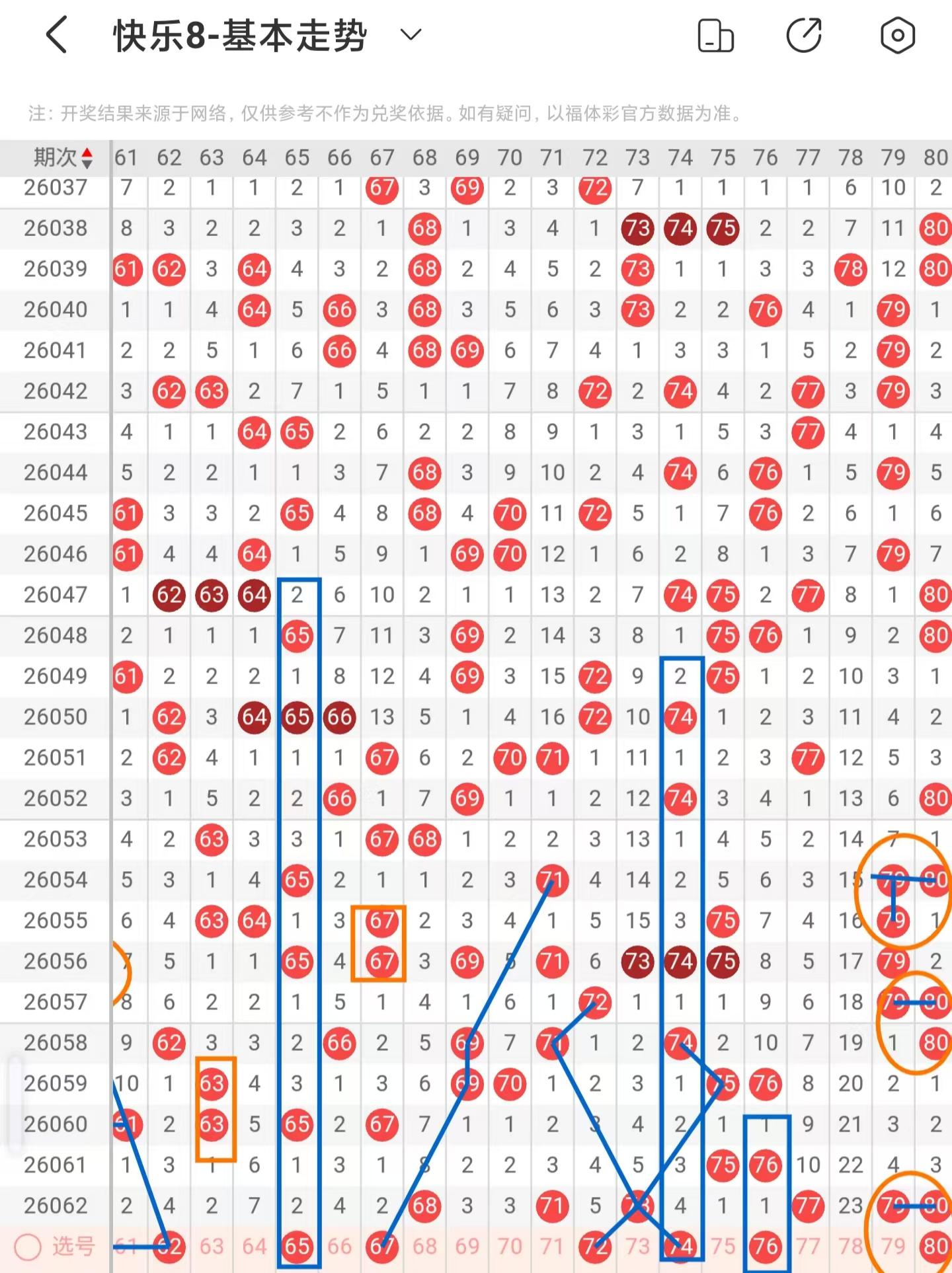 本期注意考虑一区间的稳定落号,二区间的增加落号,三区间的稳定落号,四区间的减少落号,本期推荐关注02-06-13-17-19-23-26-36-37-39-44-45-47-49-60-62-65-72-74-80。