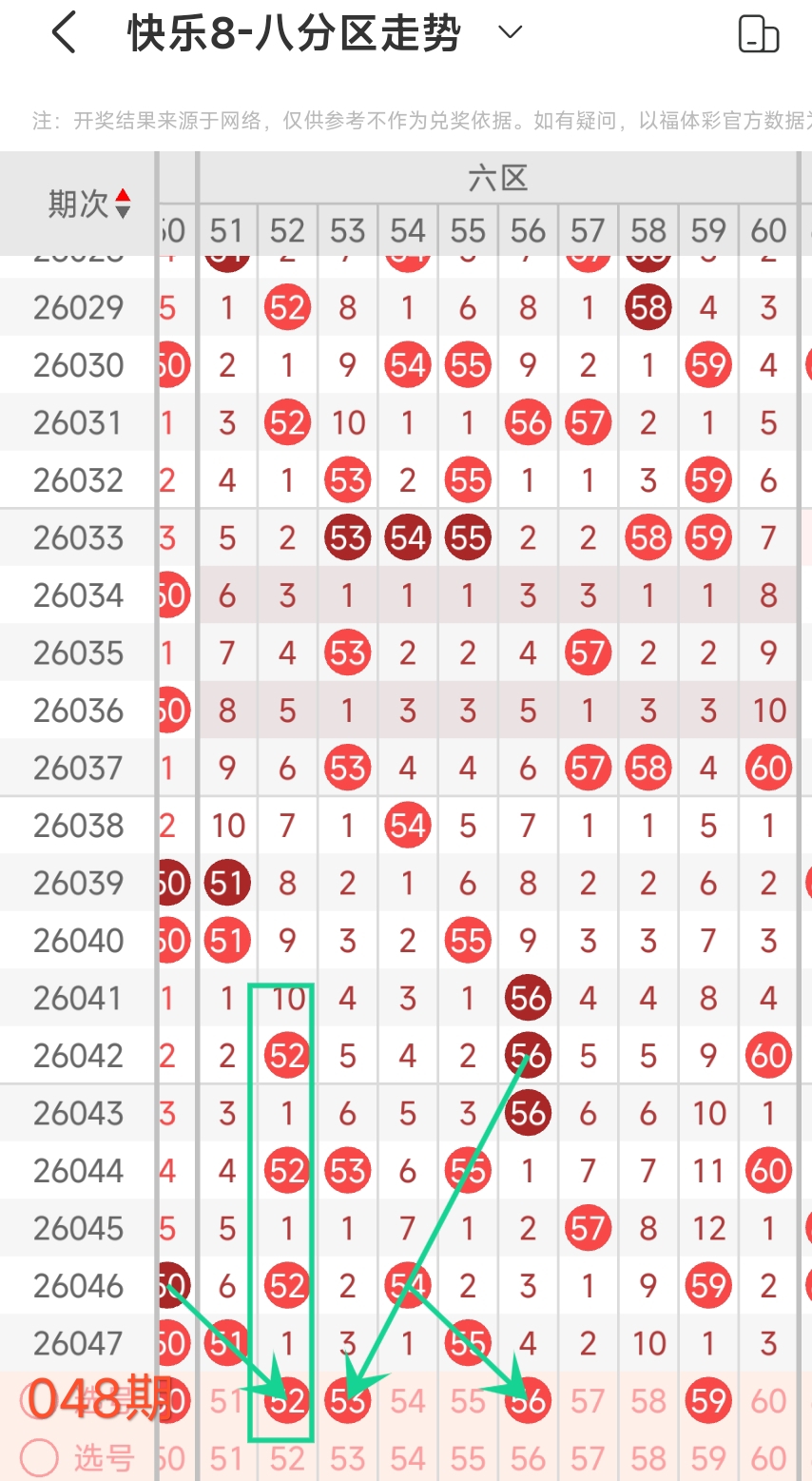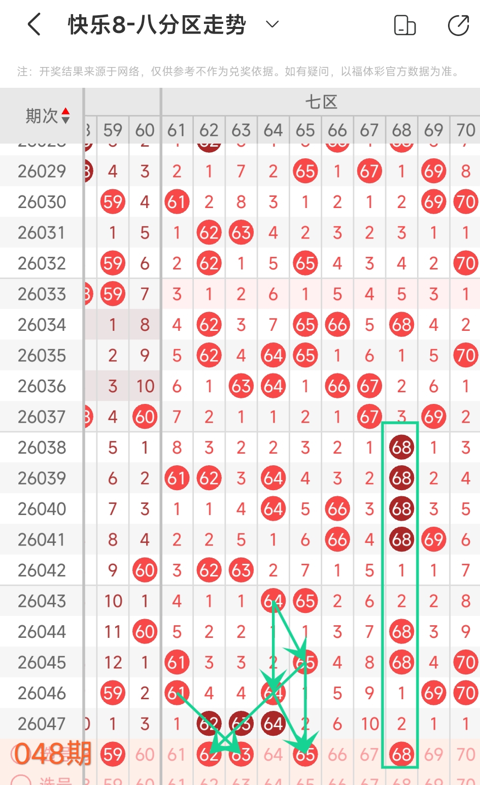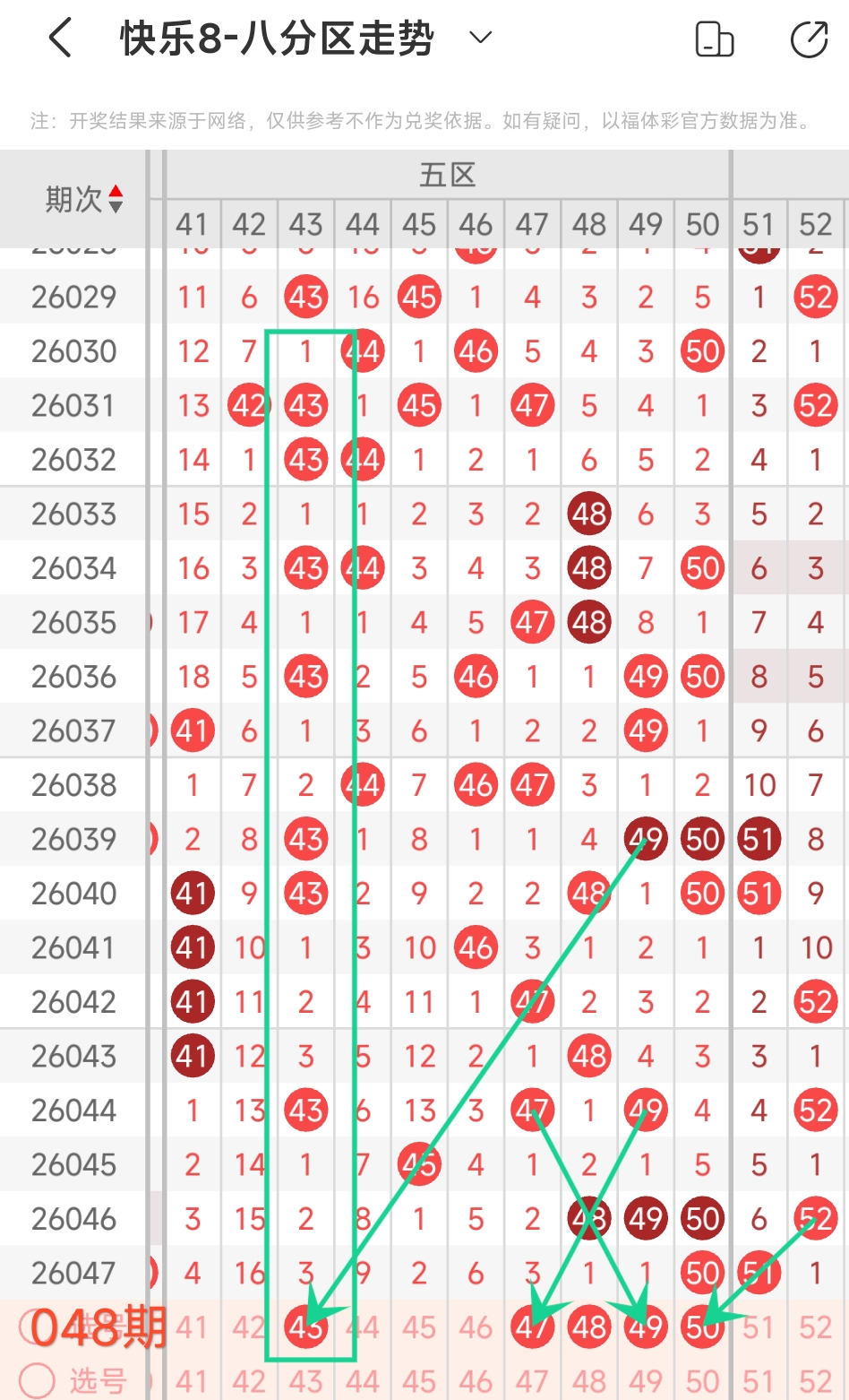 在快乐8的探索之旅中,通过对开奖走势图细致入微的观察,我们总结出一些具有参考价值的规律。几乎每一期开奖号码都呈现出以下显著特征:其一,大概率出现连号;其二,常常伴有边码;其三,遗漏值为1 2 3的号码频繁现身;其四,重号现象也较为常见。掌握这些要点,能为我们的投注提供方向指引。我们约定采用八分区走势图来展开分析。