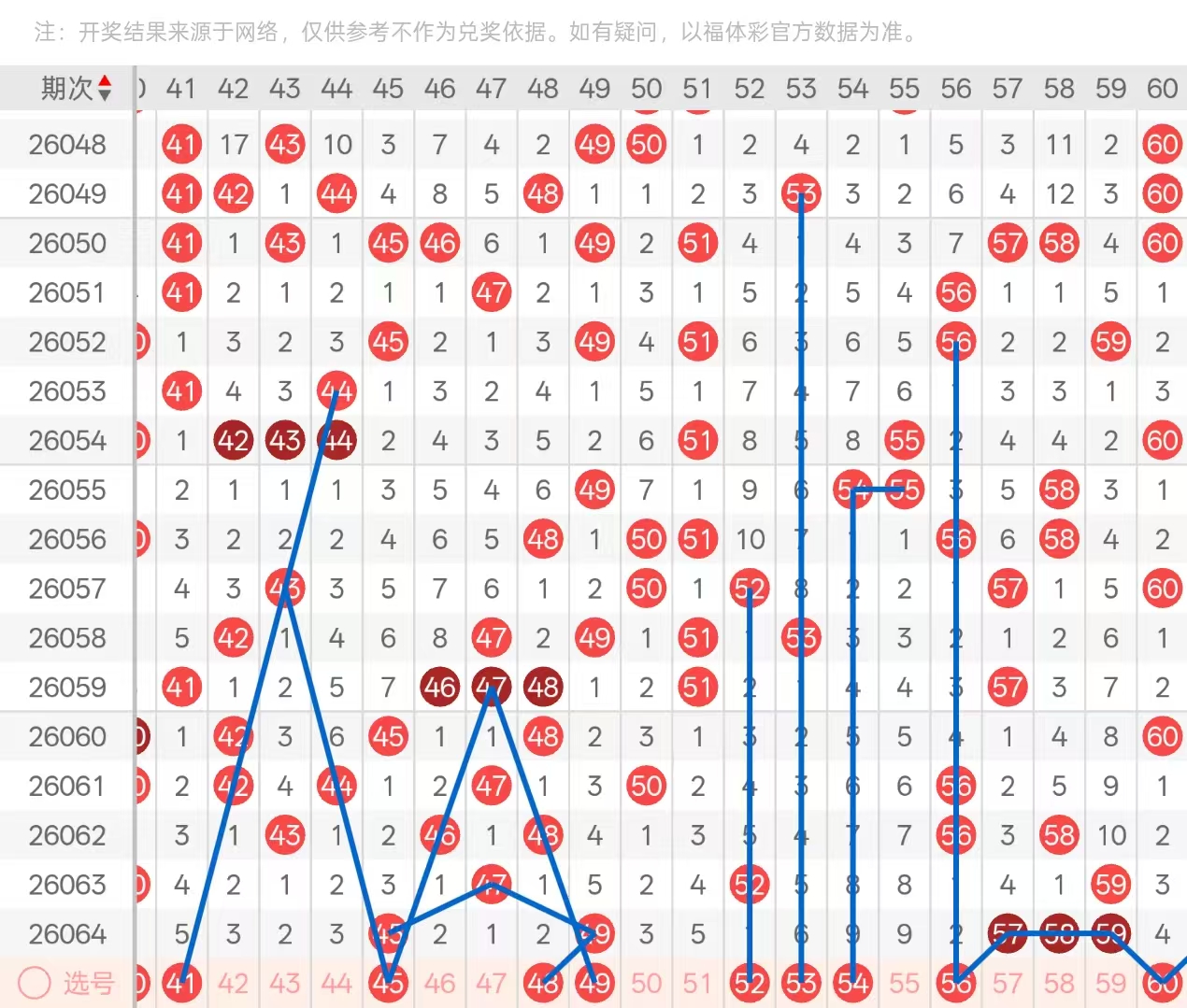 三区:三区间上期开出5码,四字头头部位置中部位置三期遗漏下落的45,尾部位置五期遗漏下落的49,均以孤码形态开出,头部位置处于放空状态。五字头开出尾部位置五十七五十八五十九三码的连号,前端部分一码没开出,处于放空状态。本期四字头头部位置可关注41的等距五下落,其次四十二四十四两码三期遗漏关注1码开出,且44为45孤码的分边号码,4549两码孤码在本期可关注一码的座重,可优先考虑45的三期遗漏座重,其次分边号码46与48,属于47菱形的分边号码,可关注1码开出,优先考虑48的两期遗漏下落。五字头本期可关注头部位置52的空1回补,以及51的重空五下落,不排除该位置以对子或连号形态开出。其次上期49开出,本期可关注五十三五十四两码的下落一码即可,54与55属于对子空9的下落关注二选一即可,尾部位置575859三连号的分边号码关注5660的下落即可做二选一。