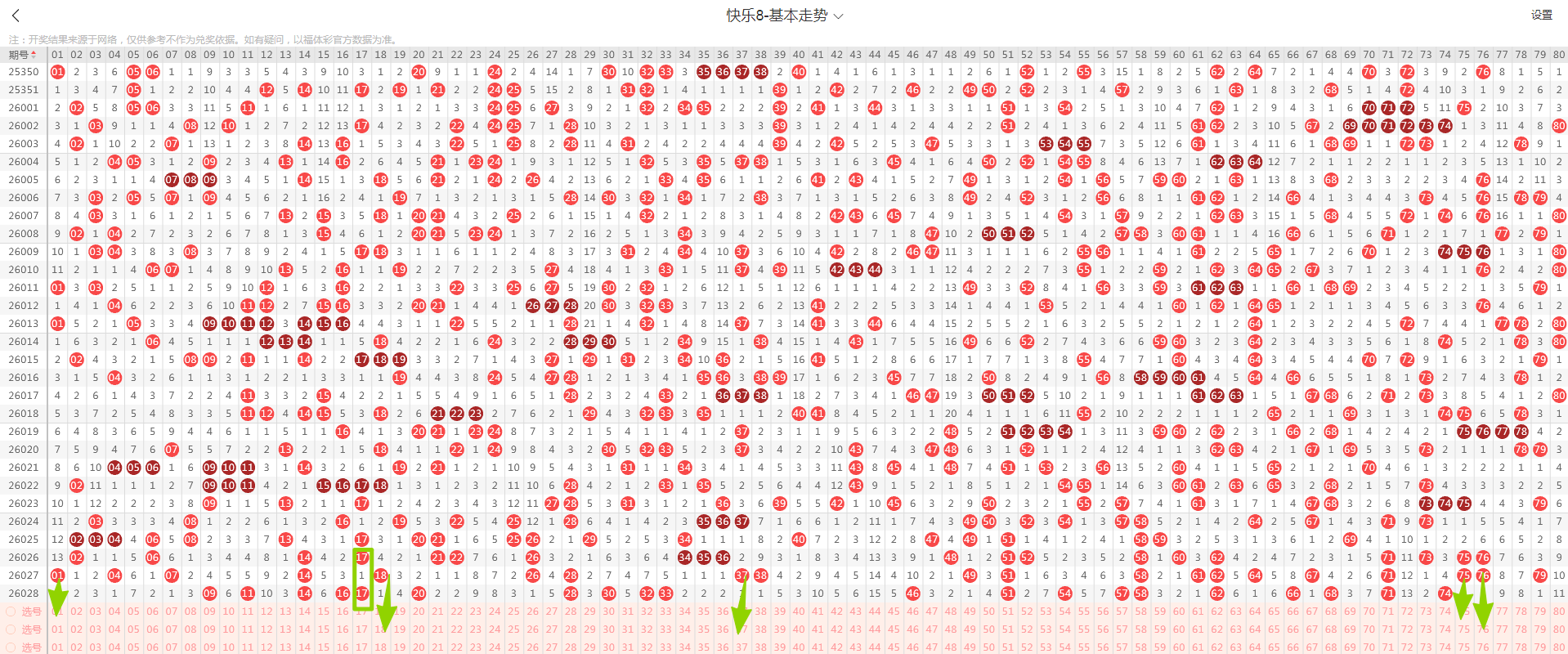 从这张走势图可以看到我画标出来了遗漏示意号码,开出了隔期(遗漏一期的)1个号码(绿色方块标示的),数量与上期降温,从近期走势图看隔期码回温态势形成,本期判断热度回温,落号5个号码概率较大(绿色箭头标示的01、18、37、75、76)需要关注,有下号概率;