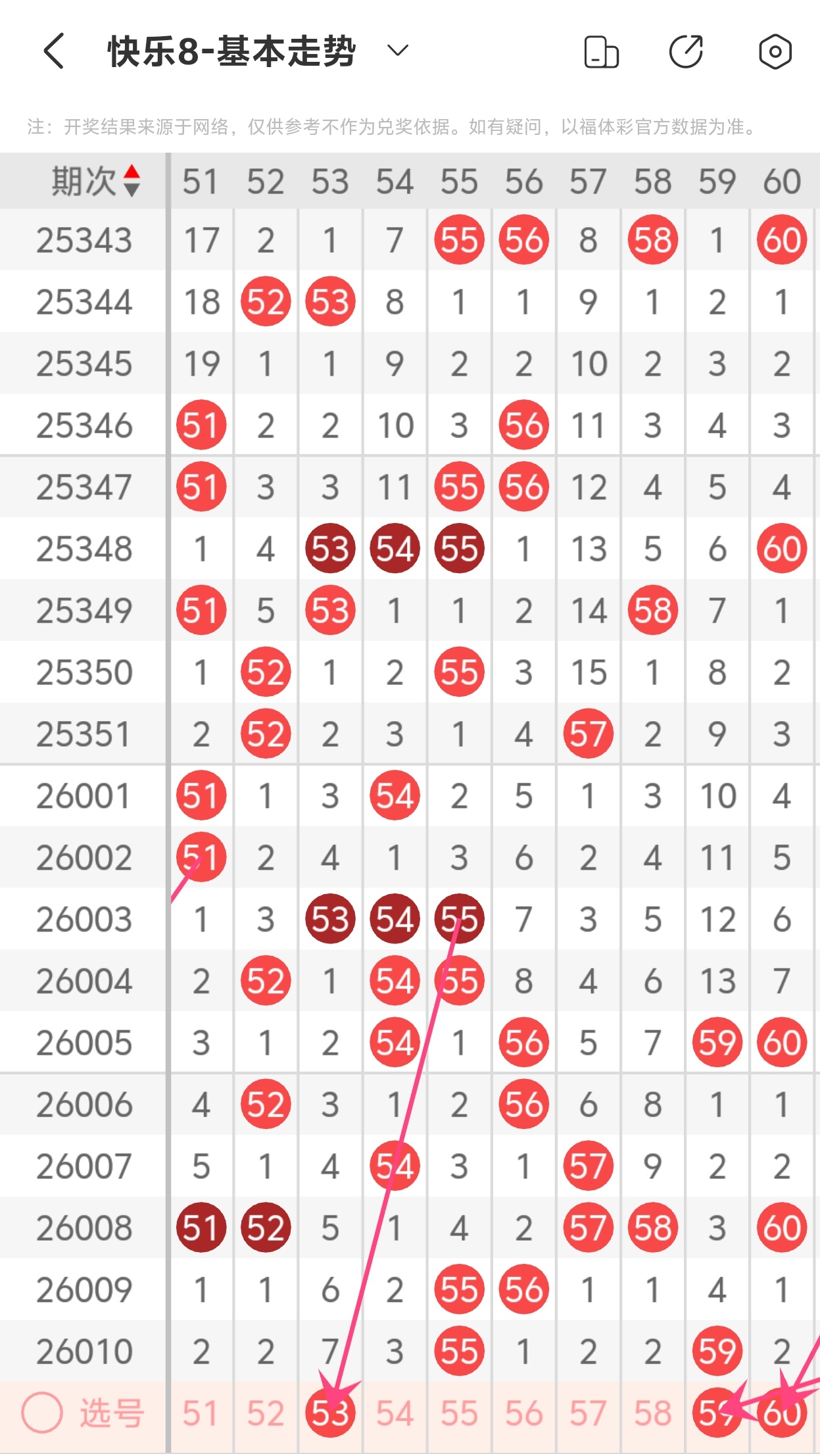 上期第六区间开出55 59,53为斜连走势,59为重码带斜连走势,60为斜连走势,本期推荐53 59
