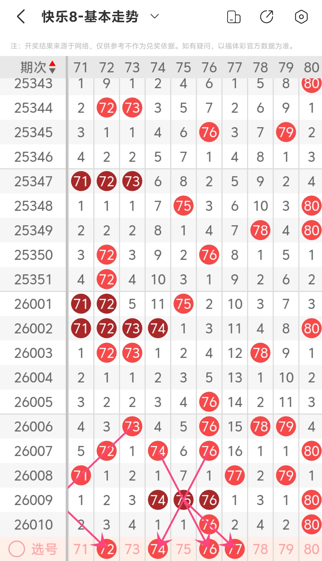 上期第八区间开出76 80,72为斜连走势,74为斜连走势,76为斜连走势,77为斜连走势,本期推荐74 76 77