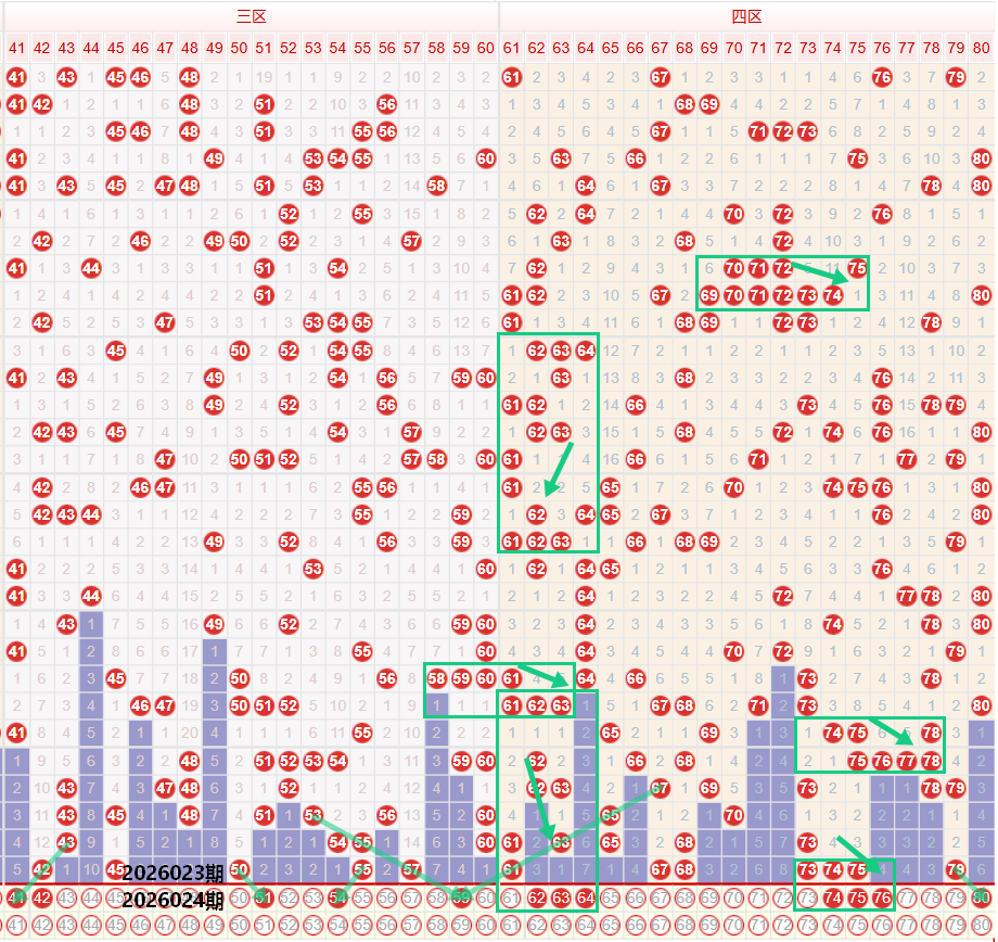 如图所示:在本期大数区的选号中注意在上期的走势中三区间开出了5枚中奖号码,落号数量出现了小幅度的上调,近期的三区间落号强度明显上升,近期建议多关注三区间的走势,有着较为明显的走热走势,在上期开出42的冷号位置,本期注意斜线第三期延续走势的41号,以及41 42的三角形态号码,在上期的3/4区间开奖结果中有着较为相似的落号形态,本期注意46 49/51 54/62 66/69 72/四组,同步向内收缩的三码走势,个人较为看好51 54的同步向内走势,三区间后段注意本期的59号,有着双奇数线束延续走势,目前已经延续至第五期,四区间上期开出了7枚中奖号码,落号形态为73 74 75的三连号走势,以及67 68的三角二连走势,从目前的单区间落号形态,以及近期的单区间形态延续走势,本期要注意四区间的落号形态有着较高的概率继续保持三连号走势,重点关注62 63 64的多期延续走势,或者是考虑在上期开出73 74 75的位置向后延续74 75 76或者是直接考虑76 77 78的夹三连走势。