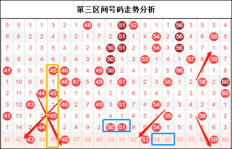 第三区间显然又让很多人失望了,完美的把所有人看好的5357绝杀了。而同时避开了4546的走势,愣是开出了44的斜连走势。这一期中面临这么多形态,又是一次抉择的机会,一个不慎可能就会选错方向。所以结合近期整体号码的冷热分析会有一定的参考作用。