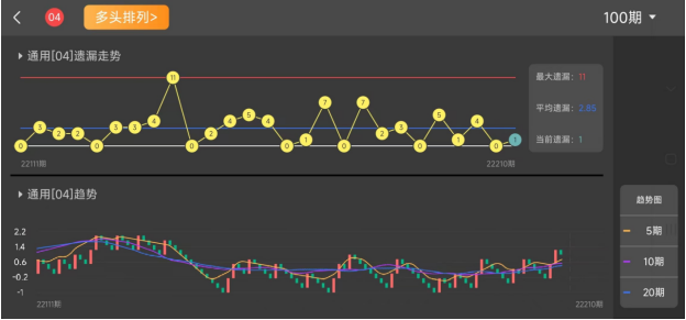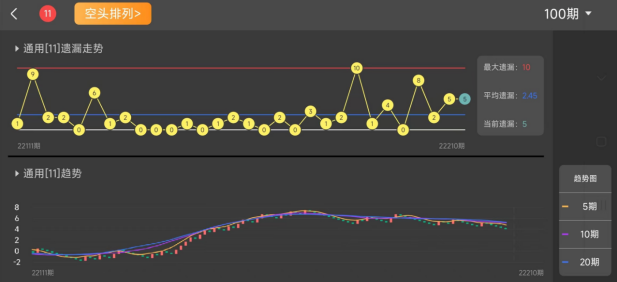 大家再来看空头排列,所谓的空头排列就是趋势向下,依次分别为20期线、10期线、5期线,这说明我们在过去的走势中,此号码近期比较冷门,犹如股票市场做短、中、长线的此时抛出都在"割肉",市场一片看坏。那这个时候的冷号我们肯定是不介入的,所以空头排列一般用来杀号使用。所以空头排列的含义就是,此号码近期出现次数少,属于冷号,应该少关注此类号码。