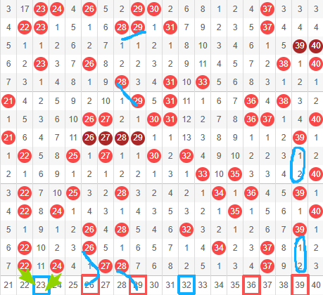 39: 如走势图,39在近15期内开出4次,每次都与40捆绑出现,上期未开出40,但本人认为39近期较热,喜欢复式的小伙伴可做备选号。