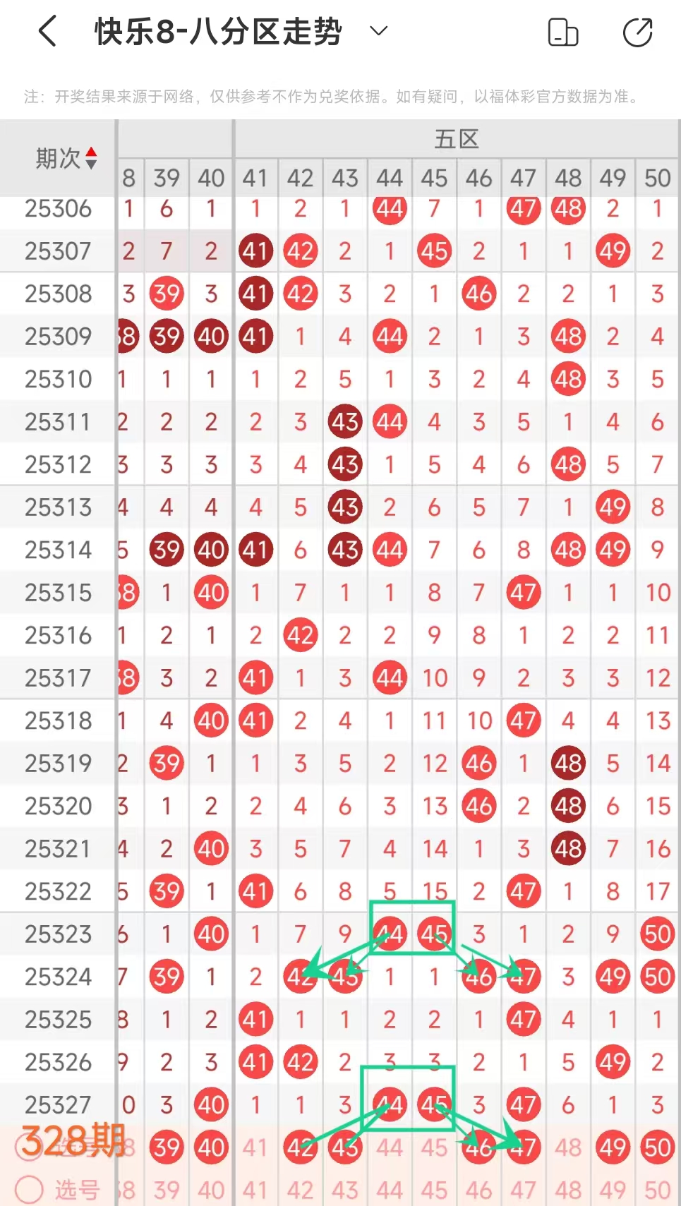 上期五区开44 45 47 这3个号码,本期该区应该出号2个左右