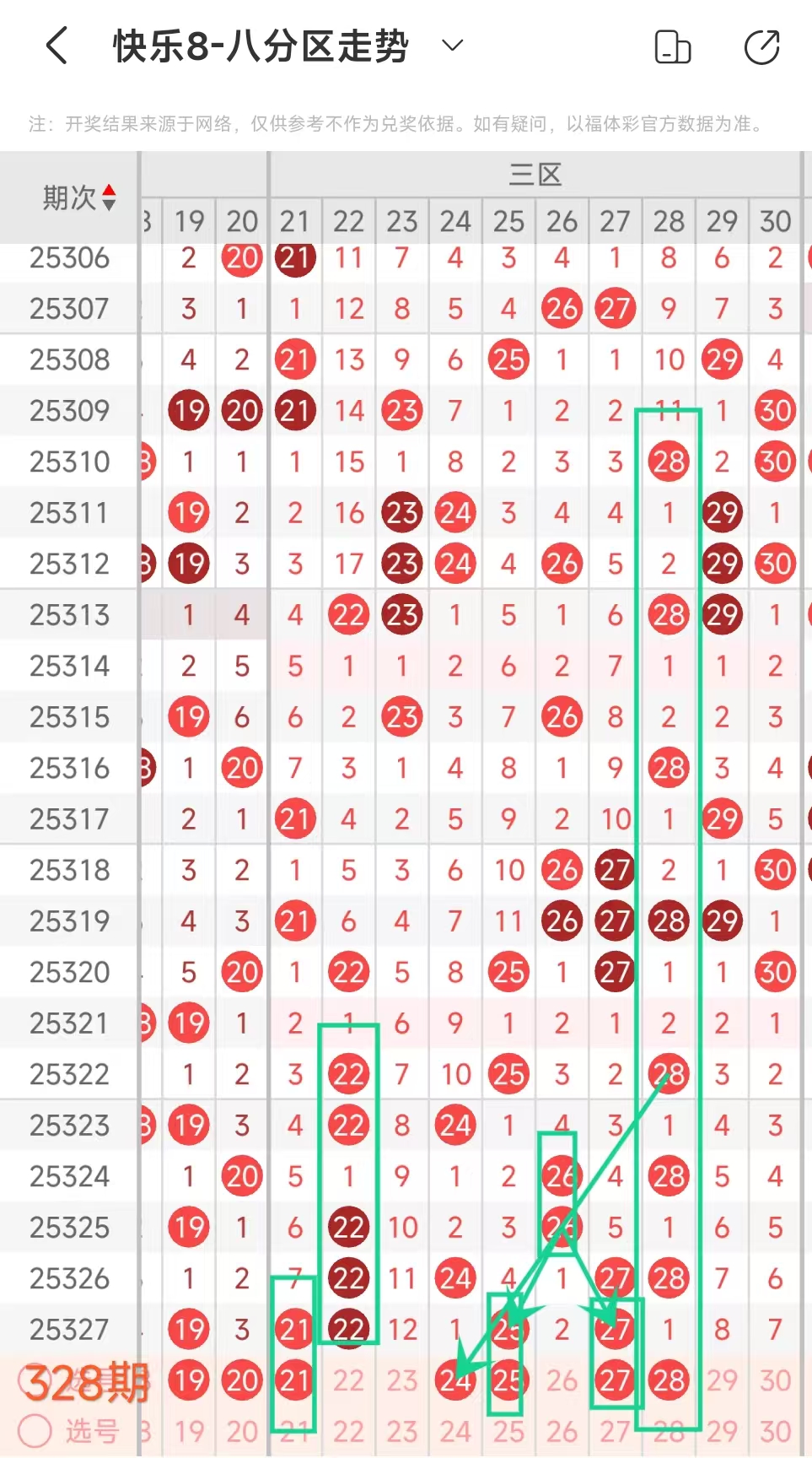 上期三区开出 21 22 25 27 这4个号码,本期考虑3个。