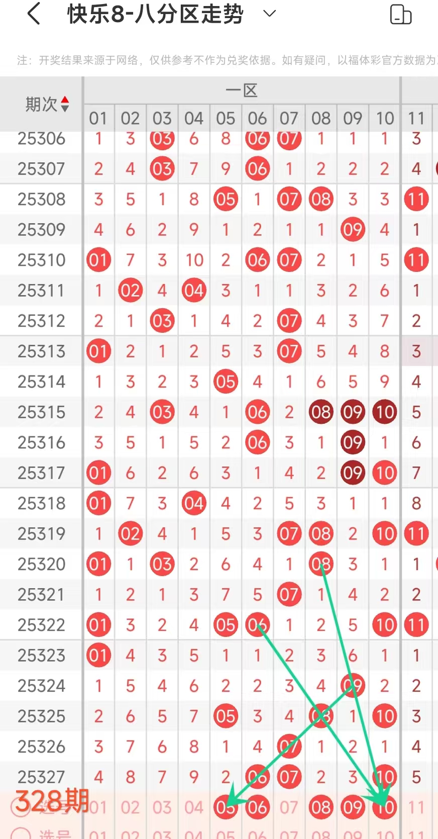 上期一区开出06 07 10这3个号 码,本期应该出2个左右。