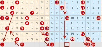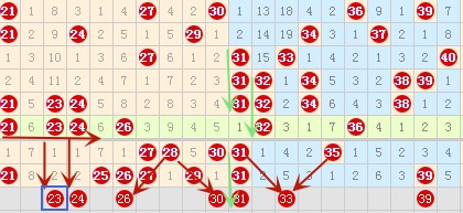 在上图中21 23 24这个类型的号码在上期中说过要落一码,果然开出了一码21号数字,那么预测本期也是要落一个号出来的,可以重点考虑。在上期开出来25 26 27 29这种类型的数字,那么本期应该也是要落一个重号的。31-40号数字这个区间有个大的等腰三角形所以我们选号尽量避开这个区域选号,实在不行再来本区域做参考。在本区域建议重点考虑重号为主。