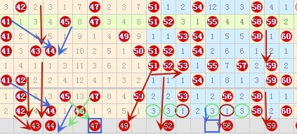 按照上图形势分析,四重号近期出现的概率有点低,我们就不做考虑了,那么在本区域如果要出重号的话,我们就可以精准定位了。如果本区间出了一个重号,我们也就可以精准定位另一个号了。上图中51 52 53 55这个类型的号码在上期没有落号,那么本期应该要落号了。这里也可以重点考虑。