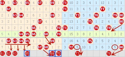 在上图中62 63 64 65号数字这个4连号在上期没有落号,那么本期最少要落一个号出来,这里可以重点考虑作手选一胆。在61-70号数字这个小区间本期应该会出3个号码,可以重点再本区域作防。在71-80号数字这个小区间一直让我头疼,出的数字及个数总是让我措手不及。所以我不建议在本期做重点考虑了,可以直接丢掉。本期分析就到这里了。