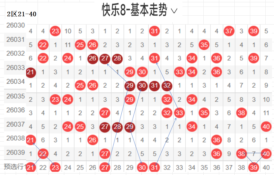 二区(21-40):遗漏5期以下有18个,0码22 27 36 38 40 5个,数据所示,冷码平均,选择条件增多了.上期开出了5个号码,出码比较分散.这期布防相应增加,重码按比例落这区较少,先给出关联码31,这个区间间接走势,温区,21-30区间上期开了2个,依旧不是重点选号区间,31-40区间开出3个,本期关注热码的回补,间隔小遗漏值最佳,3字头转热,这个小区热码注意回调,可以做关联码的布局,注重温冷码的回补.