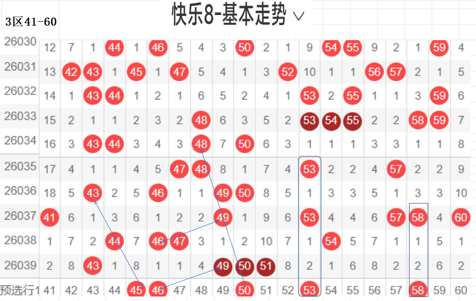 三区(41-60):遗漏5期以下有14码,0码43 49 50 51 4个,温开方式,这区码数有回暖之意,可以防一手,先定胆码走势较大者,隔期,斜三连,分边号码,可重防,间隔5期以上号码可以随走势选取,例如本期大冷码,走势比较大,可以做胆,通常联动可带出,分边对称的号码,本区间也有很大走势.可关注下.隐形夹角号码.做补位形态号码.都需要观察动态走势.以上是本区间的选码方法.