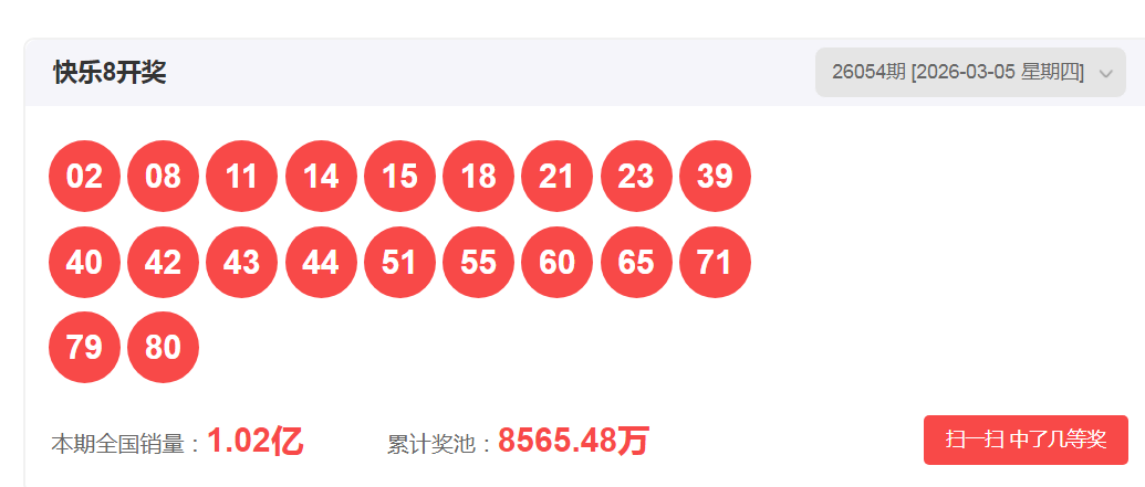 一、快乐八2026054期开奖号码