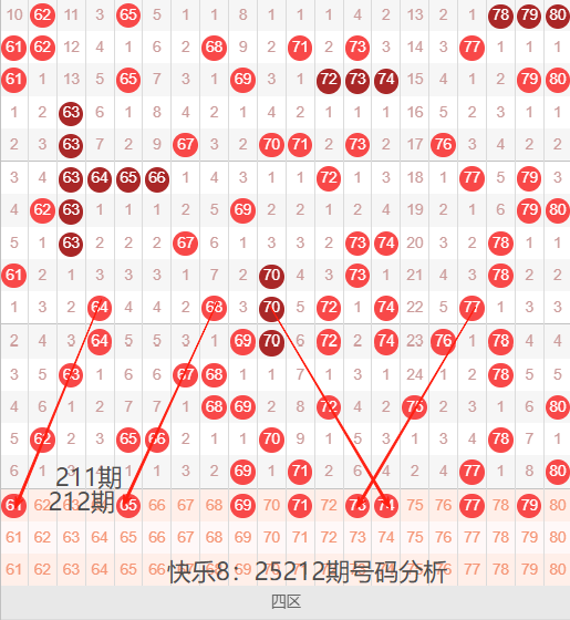 回顾25211期开奖号码:07 09 20 24 25 30 32 33 37 38 39 40 41 43 45 49 69 71 77 80 ,最近一段时间号码爆区几率特别高,目前已经连续多次出现爆区热开的情况,爆区之后基本上都是迅速回调,转换至其他区间继续暴热,大家若是能抓准区间,或许有很大的机会,但是号码的变盘规律是非常的快,很难把握,个人建议谨慎选择,不要 盲目的去操作~~