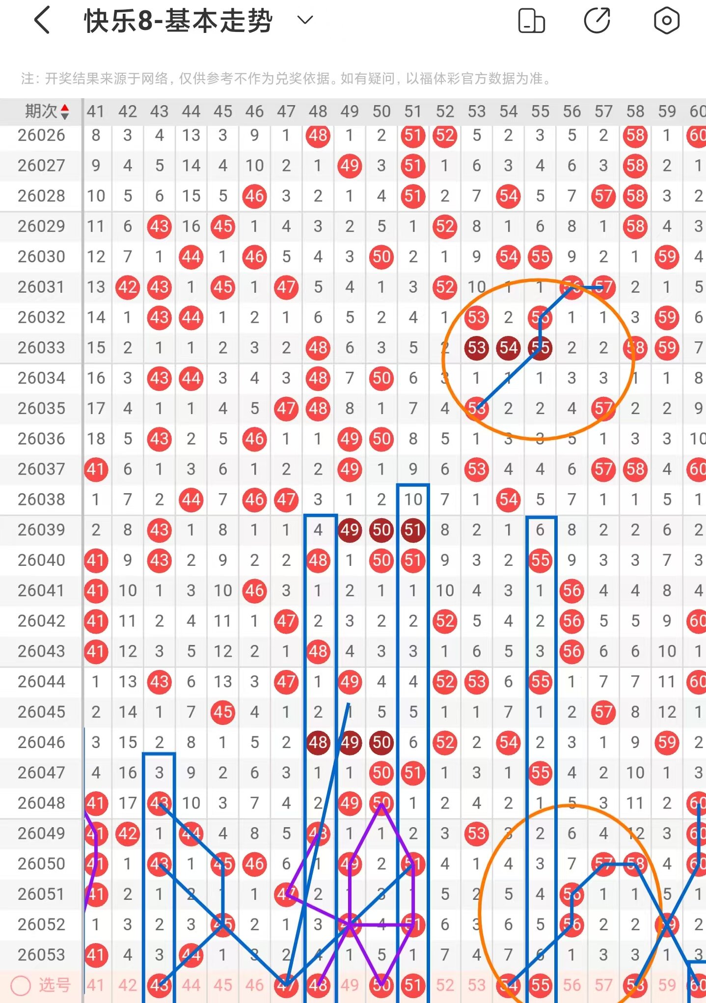 三区间上期大面积减少落号,一共开出两个号码球,本期考虑增加号码球的数量,注意隔期对称回补的43号码球,同时也是斜连走势回补号码球,注意斜连走势回补的47、54号码球,注意百期相似形态的48号码球,同时也是期数和值对称回补号码球,注意对称回补的50号码球,注意期数和值加减法的51号码球,注意隔期对称回补的55号码球,注意近期53、55、56、57号码球的走势与54、56、57、58号码球的走势相似,本期注意54号码球,注意直连转斜连走势的58号码球,阶梯落位重码走势注意60号码球,以59号码球为交叉中心点,注意分边落号的58、60号码球,因此三区间关注47-48-51-54-58,注意本区间的选二复式48-54-58。